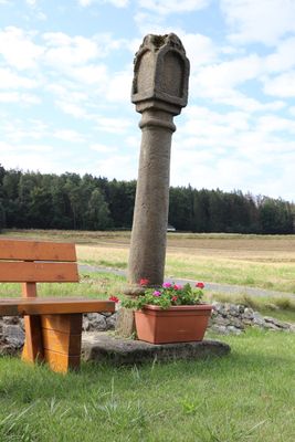 Bildstock, sogenannte Weismarter, toskanische Sandsteinsäule, vierseitiger Aufsatz, bezeichnet „1662“