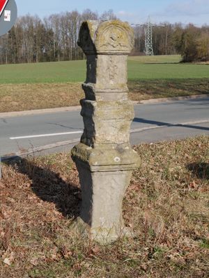 Rest eines Bildstocks, sandstein, geschweifter Vierkantsockel, vierseitiger Aufsatz, drittes Viertel 18. Jahrhundert