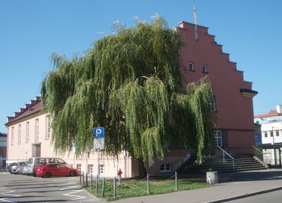 Sogenannte Jahnhalle, Turn- und Stadthalle, gestreckter Satteldachbau mit Treppengiebel und Zügen expressionistischer Architektur, von Franz Saumweber, 1928- 29