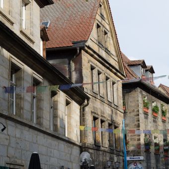 Geschlossene Reihe einheitlich behandelter, dreigeschossiger Traufseithäuser