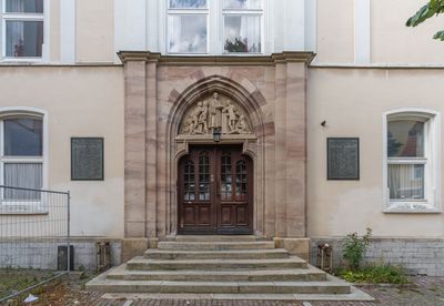 Spitzbogenportal, figürliches Tympanon mit gestufte Pilasterrahmung, Sandstein, neugotisch, 1856