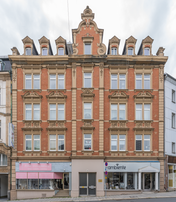 Mietshaus, viergeschossiger und traufständiger Satteldachbau mit Mittelrisalit und Zwerchgiebel, Ziegel mit Hausteingliederungen, Neurenaissance, 1899