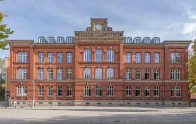 Sophienschule, drei- und viergeschossiger Flachwalmdachbau mit Risaliten und Uhrengiebel, Ziegel mit Hausteingliederungen, Neurenaissance, 1898/99