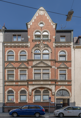 Mietshaus, 1901, dreigeschossiger und traufständiger Mansarddachbau, mit übergiebeltem Mittelrisalit und rückwärtigem Treppenturm, Ziegel mit Hausteingliederungen, Neurenaissance, 1901
