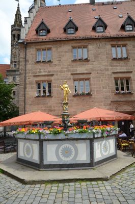 Markgraf-Georg-Brunnen, 1515 von Markgraf Georg errichtet, 1780 und 1815 Renovierungen, über polygonalem Eisenbecken auf reichverziertem Pfeiler mit vier Muschelschalen eine vergoldete Ritterfigur