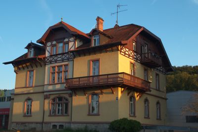 Josephshof, Gutshaus, zweigeschossiger Halbwalmdachbau mit Kniestock und Halbwalm-Zwerchhaus, Putzmauerwerk mit Kalksteinsockel, Sandsteingliederungen und Fachwerkdrempel und -giebeln, Schweizerhaus-Stil, G. Dürrlein, 1878–81