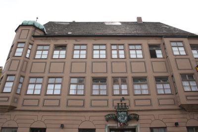 Ehemaliges Augsburger oder Raisersches Haus, gasthaus Drei Mohren, stattliches, dreigeschossiges Eckhaus mit Satteldach und polygonalem Eckerker sowie Flacherkern, von Jakob Herbrot 1554, von Gilg Vältin verändert Anfang 17. Jahrhundert, Fassade verändert 1952