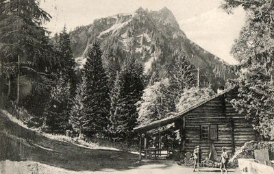 Jagdhaus, mehrteilige Anlage aus Gästehaus, Jägerhaus und Vorratshütten, eingeschossige, offene Blockbauten mit Satteldach, für Prinzregent Luitpold erbaut, 1865–87