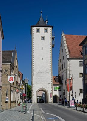 Oberer Turm, bamberger Tor, achtgeschossiger und rechteckiger Torturm der Stadtbefestigung mit Pyramidendach, gewölbter Durchfahrt und Fußgängerdurchgang, vor 1230, bis 1540 mehrmals erhöht