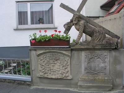 Kreuzschlepper, Sandsteinfigur, Tafel eines Bildstocks mit den Vierzehn Nothelfern, profilierter Sockel mit Kranz, spätes 18. Jahrhundert