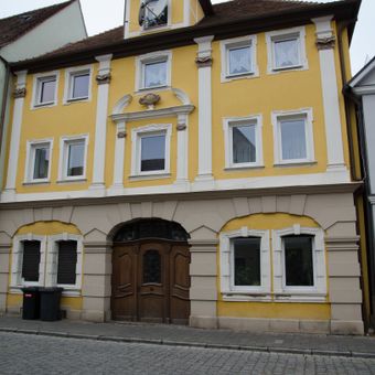 Fassade eines reich gegliederten dreigeschossigen Bürgerhauses und Holztor