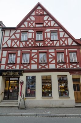 Wohn- und Geschäftshaus, zweigeschossiger Giebelbau mit Satteldach und Fachwerkobergeschoss und -giebel mit Andreaskreuzen und rautenförmigem Gitterwerk, Türsturz bezeichnet „1670“