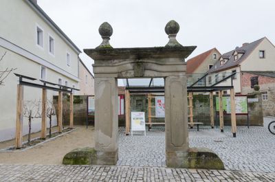 Barocktor, pfosten mit Spiegeln, Architrav mit Profilierung und Kugelaufsätzen, Radabweiser, Sandstein, bezeichnet „1778“