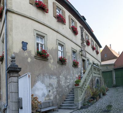 Weingut, Weingut des Würzburger Juliusspitals, zweigeschossiger Mansarddachbau mit geohrten Fenster- und Türrahmungen, doppelläufige Freitreppe, Immaculata, 1724-26, zugehörige Nebengebäude, Stadtmauer.