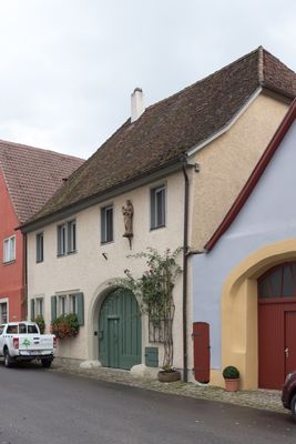 Wohnhaus, zweigeschossiger traufständiger Halbwalmdachbau mit verputztem Fachwerkobergeschoss und rundbogiger Tordurchfahrt, bezeichnet „1721“
