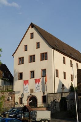 Ehemals Zehntscheune, langgestreckter zweigeschossiger Satteldachbau über Kellerhanggeschoss hoch aufragend, Putzfassade mit Sandsteinrahmungen, nachgotisch, bez. 1605 und 1614