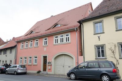 Wohnhaus, zweigeschossiger traufständiger Satteldachbau mit korbbogiger Einfahrt, Fledermausgauben und geohrten Fensterrahmungen, 18. Jahrhundert
