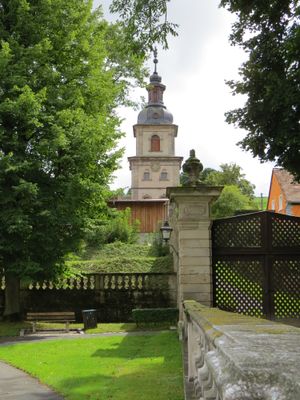 Marienturm, viergeschossiger Eckturm der Klosterummauerung, Obergeschoss eingezogen, welsche Haube mit vergoldeter Muttergottes, Wappen des Abtes H. Held, bezeichnet „1745“, wohl von Johann Jakob Michael Küchel