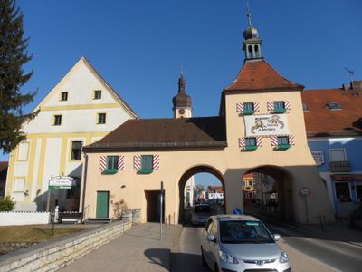 Unteres Stadttor, Torturm mit angeschlossenem Torhaus, dreigeschossiger Massivbau mit flachgedeckter Durchfahrt und Zeltdach mit Laterne, seitlich angeschlossener, zweigeschossiger und traufseitiger Massivbau mit Satteldach und Durchfahrt, Torturm im Kern 14. Jahrhund
