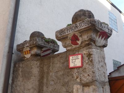 Hoftorpfeiler, mit Wappenreliefs, 17. Jahrhundert