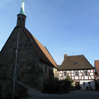 Wohnhaus, zweigeschossiger traufständiger Walmdachbau mit Fachwerkobergeschoss, bezeichnet „1780“
