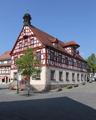 Ehemaliges Rathaus, freistehender zweigeschossiger Satteldachbau mit Fachwerkobergeschoss, Zwerchhaus und barockisierendem Dachreiter, im Kern dendrochronologisch datiert 1407, Aufstockung und Zwerchhaus 1781, Veränderung zum fachwerksichtigen Satteldachbau und Dachrei