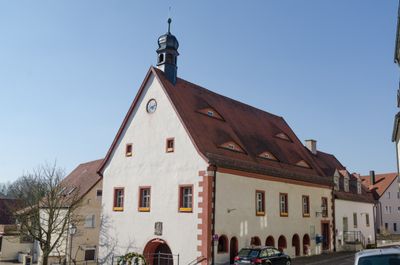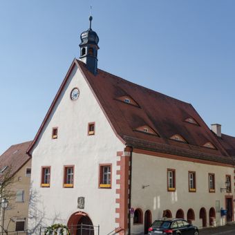 Altes Rathaus, zweigeschossiger Satteldachbau mit Dachreiter, um 1470, 1652–1679 wiederhergestellt, Wappen am spätgotischen Portal an der Südseite, Fleisch- und Brotbänke in der östlichen Langseite erhalten
