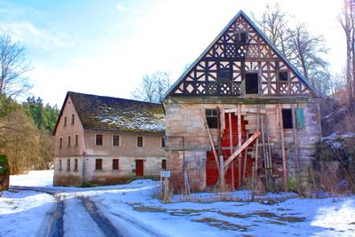 Mühlengehöft, wohnstallhaus, zweigeschossiger Sandsteinquaderbau mit Satteldach und Fachwerkgiebel, bezeichnet „1830“; Wohnhaus, zweigeschossiger Sandsteinquaderbau, Obergeschoss verputzt, bezeichnet „1911“, mit älteren Teilen; Kellerhäuser aus Sandstein