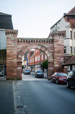 Unteres Tor, runder Torbogen zwischen zwei Wehrturm-imitierenden Pfeilern, oberer Abschluss mit Schmuckzinnen über Konsolfries, Sandstein, nach 1839, die seitlichen Fußgängerpforten in der Stadtmauer wohl 20. Jahrhundert
