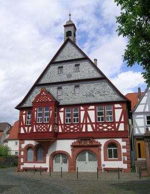 Altes Rathaus, zweigeschossiger Satteldachbau mit Fachwerkobergeschoss in Ecklage, verputztes Erdgeschoss mit Renaissanceportalen und Werksteinkanten und -rahmungen, im Innern dreischiffige Halle mit Rundbogenarkade, bzw. säulengestütztem Unterzug, vorkragendes O