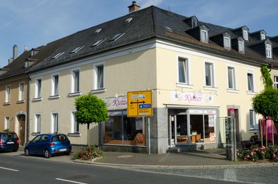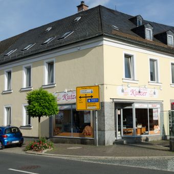Wohnhaus in Ecklage, zweigeschossiger Bau mit abgewalmtem Schieferdach, Mitte 19. Jahrhundert, Erdgeschoss durch Ladeneinbau verändert