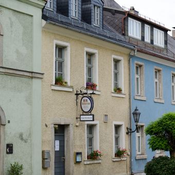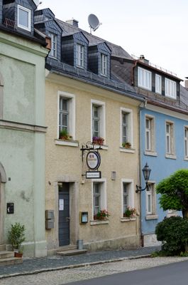 Wohnhaus, zweigeschossiger Traufseitbau, profilierte Granit-Türrahmung, Schieferdach mit stehenden Gauben, um 1835