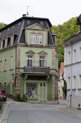 Eckhaus, zweigeschossiges Wohn- und Geschäftshaus mit steilem Mansarddach, Haustein und Putzgliederungen, historistisch, um 1900