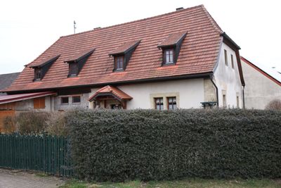 Halbwalmdachhaus, eingeschossig, massiv, mit Halbwalmdach, geohrte Fenster- und Türrahmungen, spätes 17./frühes 18. Jahrhundert