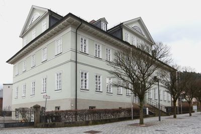Glockenbergschule, stattlicher zweigeschossiger Biedermeierbau mit Walmdach und Zwerchhäusern, Freitreppe, 1831–1832 (bez. 1833); vgl. Ensemble Marktplatz.
