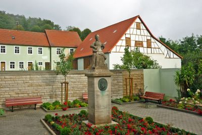 Viktor-von-Scheffel-Denkmal, auf Sockel mit Medaillon Knabenskulptur mit Laute, 1933; gegenüber Haus Nummer 6