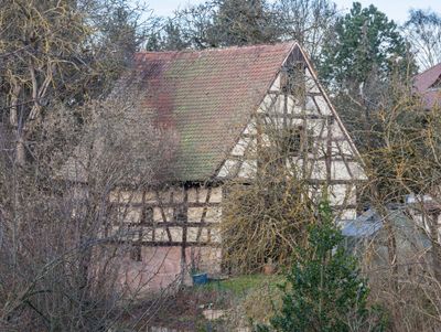 Zugehöriger Stadel, eingeschossiger Fachwerkbau mit Satteldach, 18./19. Jahrhundert