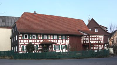 Bauernhaus, zweigeschossiges Fachwerkhaus, mit Schopfwalmdach, zum Teil verschiefert, Anfang 19. Jahrhundert