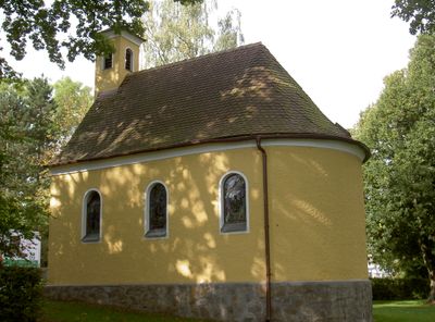 Kapelle St. Leonhard, giebelständiger Saalbau mit abgewalmtem Satteldach und Giebeltürmchen mit Zeltdach, 1930; mit Kirchenausstattung