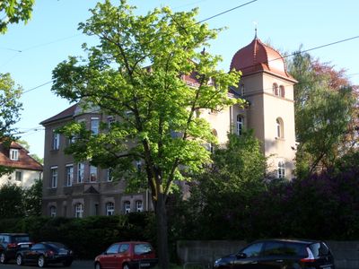 Mietshaus, dreigeschossiger Walmdachbau mit Sandsteingliederung, Loggien, Erkern, Dachgauben mit Krüppelwalmdach, Zwerchgiebel und Treppenturm mit Haubendach, reduzierter Neu-Nürnberger-Stil, von Valentin Nickel, 1905