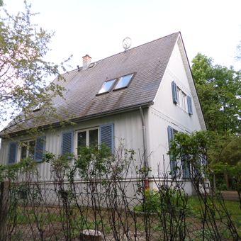 Einfamilienhaus, fertighaus, erdgeschossiger Satteldachbau in Stahlblech-Tafelbauweise auf gemauertem Sockel, von MAN-Gustavsburg, 1951