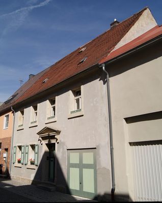Wohnhaus, zweigeschossiger, traufständiger und verputzter Massivbau mit Satteldach, Sandsteinportal und -fensterfaschen, in neubarocken Bauformen, Umbau bezeichnet „1839“