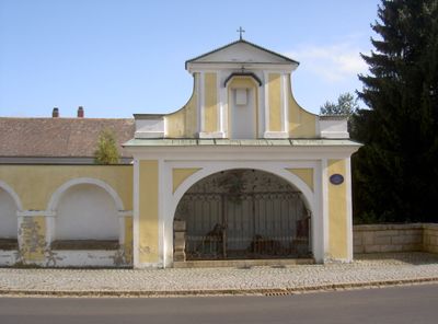 Reste der ehemaligen Klostermauer, 15. Jahrhundert, mit erneuerten Blendarkaden und kapellenartiger Nische für Ölberggruppe, um 1760