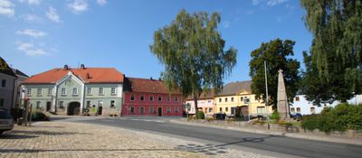 Ensemble Hauptstraße/Marktplatz, die städtebaulich wichtigste Linie des Marktes ist der breite Hauptstraßenzug, der in einer leichten Kurvenführung zum unregelmäßig geformten Marktplatz hinführt. Die Hauptstraße wird gebildet durch weitgehend geschlossene Reihen zweigeschossi