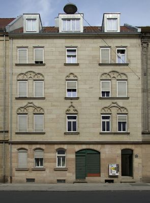 Mietshaus, viergeschossiger traufseitiger Satteldachbau mit Sandsteinfassade, gotisierendem Blendmaßwerkdekor, historisierend, von Georg Schneider, 1904
