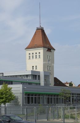 Wasserturm des ehemaligen „Neuen“ Städtischen Gaswerks, sechsgeschossiger Putzbau mit Uhrenerker und steilem Pyramidendach, historisierend, vom Stadtbauamt Fürth, 1903-06.