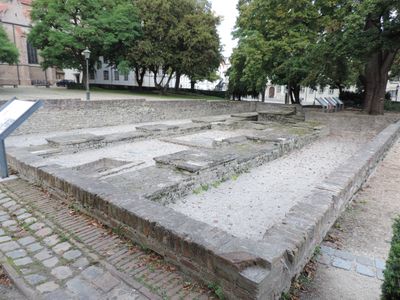 Fundamente der Tauf- und Seelsorgekirche St. Johann, unter Bischof Ulrich 956–60 erbaut, 1808 abgebrochen, Fundamente 1928/30 wieder freigelegt, Reste des im 6./7. Jahrhundert errichteten Vorgängerbaues, der im Westteil eine Taufbrunnenstelle des 4./5. Jahrhunderts mit einschloss, daneben Reste eine