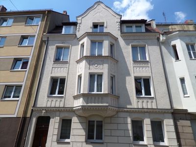 Mietshaus, dreigeschossiger Mansarddachbau mit Zwerchgiebel, Putzbau mit rustiziertem Erdgeschoss, zweigeschossigem, dreiseitigem Erker und reichem Jugendstildekor, um 1908