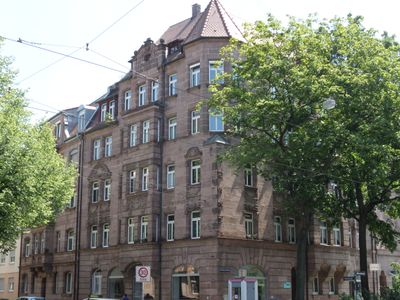 Mietshaus in Ecklage, fünfgeschossiger Satteldachbau mit Zwerchgiebeln und Schleppgauben, Sandsteinquaderbau mit zwei dreigeschossigen, zweiachsigen Sandsteinerkern und zweigeschossigem, dreiseitigem Eckturm mit Spitzhelm, reicher Jugendstildekor, bezeichnet „1908“