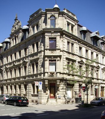 Mietshaus in Ecklage, dreigeschossiger Mansarddachbau mit reich gegliederter Sandsteinfassade, Zwerchhaus mit Ziergiebel, Erker und Dachausbau an der abgeschrägten Ecke, Neurenaissance, von Leo Gran, bez. 1887;